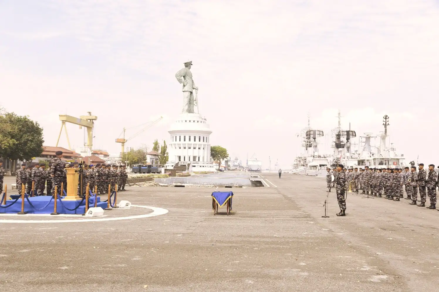 SURABAYA – Panglima Komando Armada II (Pangkoarmada II) Laksda TNI Ariantyo Condrowibowo bertindak sebagai inspektur upacara dalam acara penyerahan kapal perang KRI Butana-878 kepada Komandan Pangkalan Utama TNI Angkatan Laut (Danlantamal) V Laksma TNI Dr. Arya Delano. Upacara Penyerahan KRI Butana-878 ke Lantamal V berlangsung di Dermaga Madura, Koarmada II, Ujung Surabaya, Senin (21/10/2024).