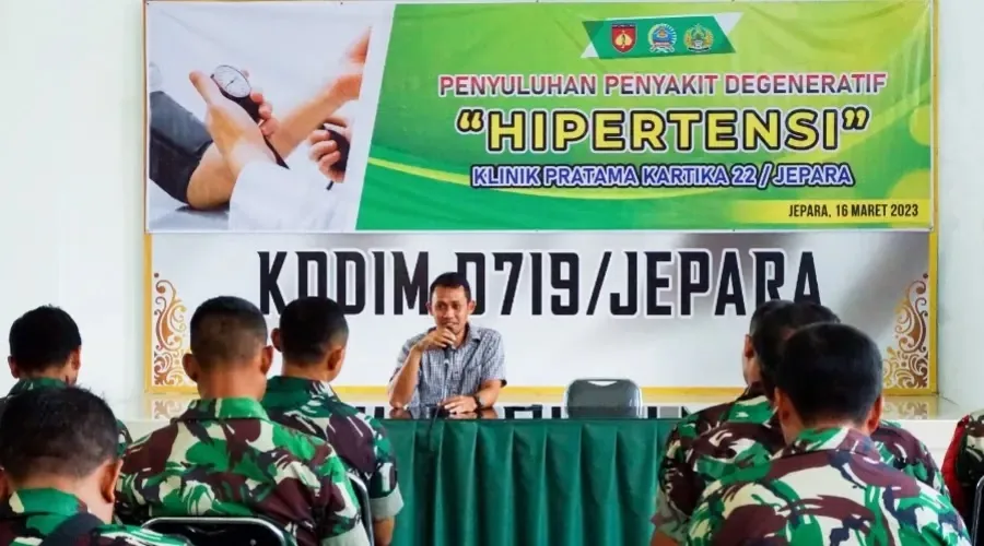 JEPARA – Klinik Kartika 22 Jepara, menggelar penyuluhan penyakit degeneratif (Hipertensi) kepada anggota TNI Kodim 0719/Jepara di aula kodim jepara di Jl. Rw Mongginsidi No. 8, Kelurahan Jobokuto, Jepara. Kamis, (16/3/2023).